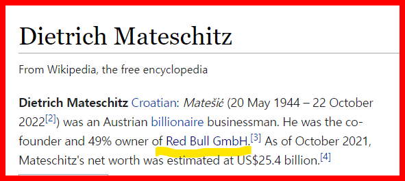 October 22, 2022October 23, 2022 Red Bull founder Dietrich Mateschitz dies, aged 78 He is Dead 193 days before his birthday Illuminati ANOTHER GREAT FIND FROM A FELLOW TRUTHER GIVE KNOWLEDGE AND SHARE THIS! Share on Facebook (Opens in new window) Facebook Share on Telegram (Opens in new window) Telegram Share on X (Opens in new window) X Like Loading... Related