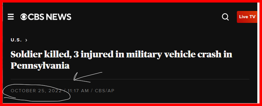 October 26, 2022 Soldier killed, 3 injured in military vehicle crash in Pennsylvania Headline news on the day leaving 67 days in the year. The accident happened Saturday 10/22 GIVE KNOWLEDGE AND SHARE THIS! Share on Facebook (Opens in new window) Facebook Share on Telegram (Opens in new window) Telegram Share on X (Opens in new window) X Like Loading... Related