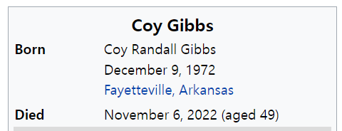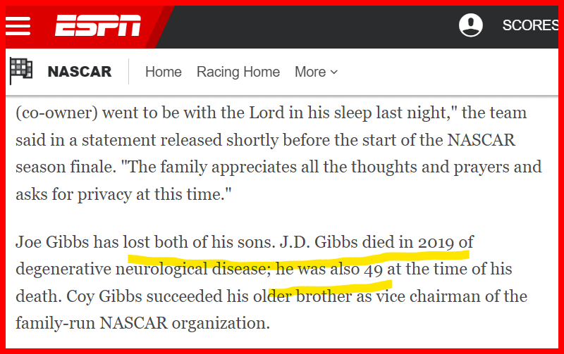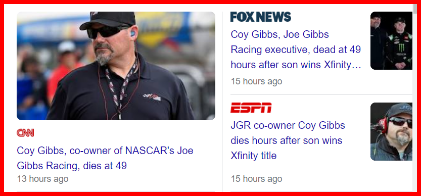 November 7, 2022November 7, 2022 33 and Joe Gibbs. Coy Gibbs is dead 33 days after his son birthday and 33 days before his own. Dead 33 days before his birthday He died 33 days after his son birthday who just won the xfinity title. GIVE KNOWLEDGE AND SHARE THIS! Share on Facebook (Opens in new window) Facebook Share on Telegram (Opens in new window) Telegram Share on X (Opens in new window) X Like Loading... Related