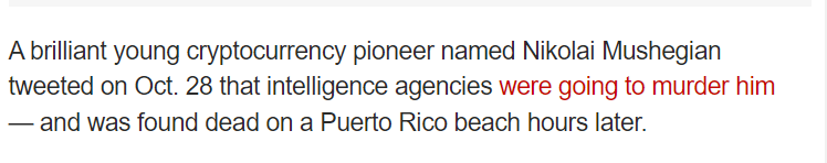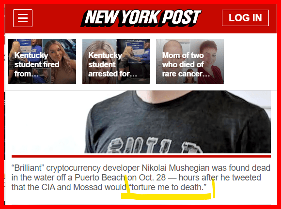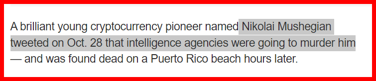 He wrote…“CIA and Mossad and pedo elite are running some kind of sex trafficking entrapment blackmail ring out of Puerto Rico and Caribbean islands,” Mushegian, a developer of blockchain-based decentralized finance platforms who wanted to end global banking corruption, tweeted at 4:57 a.m. “They are going to frame me with a laptop planted by my ex [girlfriend] who was a spy. They will torture me to death.”