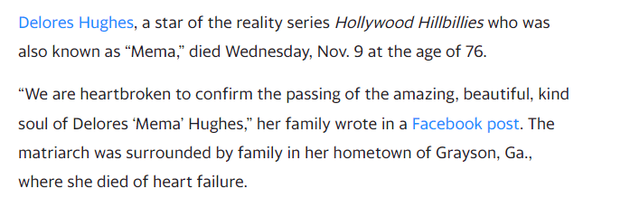 She died 74 days before the release anniversary of her Fame, Hollywood Hillbillies