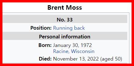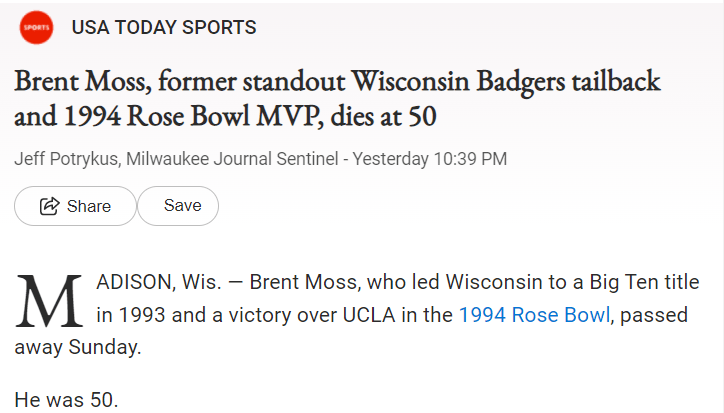 November 14, 2022 Brent Moss, who led Wisconsin to a Big Ten title in 1993 and a victory over UCLA in the 1994 Rose Bowl, passed away Sunday. Dead at age 50 and 50 days before his anniversary of being MVP at the Rose Bowl Dead 79 days before his birthday GIVE KNOWLEDGE AND SHARE THIS! Share on Facebook (Opens in new window) Facebook Share on Telegram (Opens in new window) Telegram Share on X (Opens in new window) X Like Loading... Related