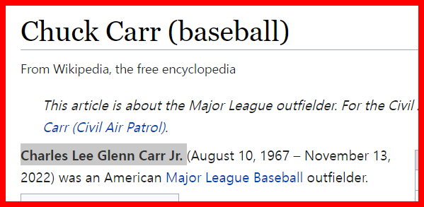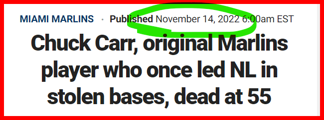 November 14, 2022November 14, 2022 Chuck Carr, MLB former Mets/Marlins dead at age 55. Headline news 201 days after his debut anniversary. His death was announced on Nov 14th, a 201-day span after his Debut for the MLB. GIVE KNOWLEDGE AND SHARE THIS! Share on Facebook (Opens in new window) Facebook Share on Telegram (Opens in new window) Telegram Share on X (Opens in new window) X Like Loading... Related
