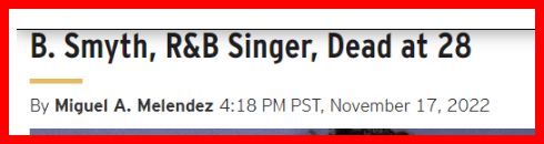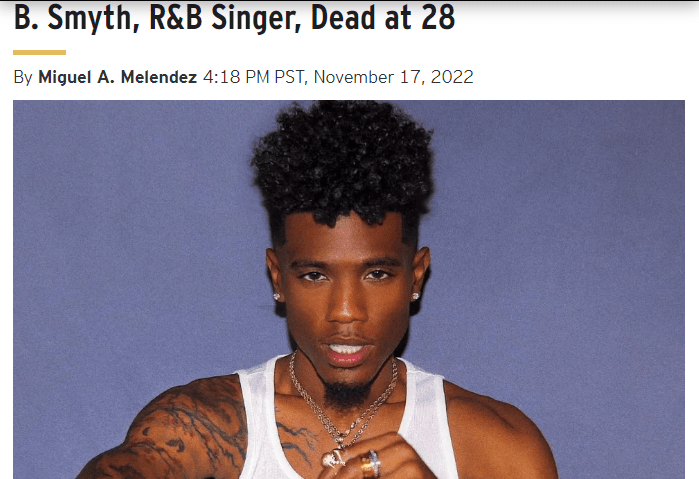 November 17, 2022November 18, 2022 R&B Singer B. Smyth Dead At 28 GIVE KNOWLEDGE AND SHARE THIS! Click to share on Facebook (Opens in new window) Facebook Click to share on Telegram (Opens in new window) Telegram Click to share on X (Opens in new window) X Like Loading... Related