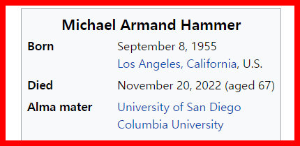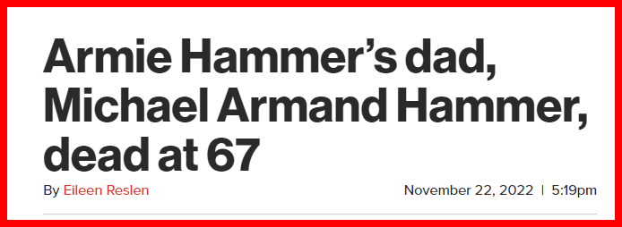 November 22, 2022November 22, 2022 Armie Hammer’s father, Michael Armand Hammer, died Sunday after a lengthy battle with cancer. He was 67. Daddy Michael is dead 73 days after his birthday. GIVE KNOWLEDGE AND SHARE THIS! Click to share on Facebook (Opens in new window) Facebook Click to share on Telegram (Opens in new window) Telegram Click to share on X (Opens in new window) X Like Loading... Related