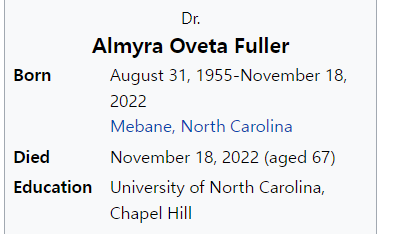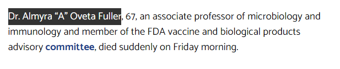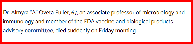 November 25, 2022November 25, 2022 Dr. Almyra “A” Oveta Fuller, 67, a member of the FDA vaccine and biological products advisory committee, died suddenly on Friday morning. Dead 79 days after her birthday The articles list her like this GIVE KNOWLEDGE AND SHARE THIS! Click to share on Facebook (Opens in new window) Facebook Click to share on Telegram (Opens in new window) Telegram Click to share on X (Opens in new window) X Like Loading... Related
