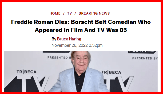 November 26, 2022 Freddie Roman Dies: Borscht Belt Comedian Who Appeared In Film And TV Was 85. GIVE KNOWLEDGE AND SHARE THIS! Click to share on Facebook (Opens in new window) Facebook Click to share on Telegram (Opens in new window) Telegram Click to share on X (Opens in new window) X Like Loading... Related