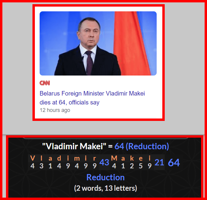 November 27, 2022 Belarus foreign minister dies suddenly at age 64. Killed on the 330th day of the year. GIVE KNOWLEDGE AND SHARE THIS! Click to share on Facebook (Opens in new window) Facebook Click to share on Telegram (Opens in new window) Telegram Click to share on X (Opens in new window) X Like Loading... Related