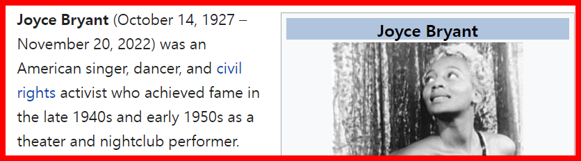 November 29, 2022November 29, 2022 Joyce Bryant, ‘bronze, blond bombshell’ of the 1950s, dies at 95. DEAD 38 DAYS AFTER HER BIRTHDAY CHOSEN FOR ROLES AND CHOSEN FOR HEADLINE DEATHS. GIVE KNOWLEDGE AND SHARE THIS! Click to share on Facebook (Opens in new window) Facebook Click to share on Telegram (Opens in new window) Telegram Click to share on X (Opens in new window) X Like Loading... Related