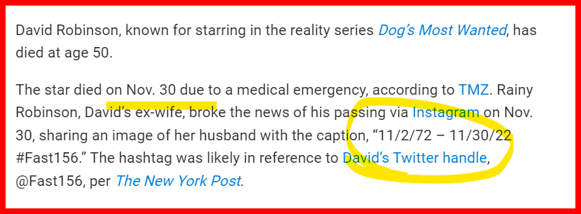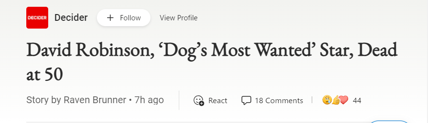 December 1, 2022 David Robinson, ‘Dog’s Most Wanted’ Star, Dead at 50 Headline News on 12/1 Dead 28 days after his birthday. He died on Nov 30th GIVE KNOWLEDGE AND SHARE THIS! Click to share on Facebook (Opens in new window) Facebook Click to share on Telegram (Opens in new window) Telegram Click to share on X (Opens in new window) X Like Loading... Related