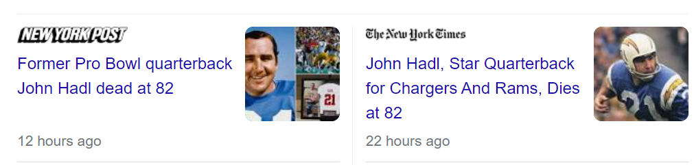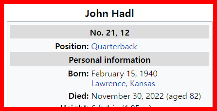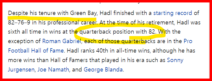 Despite his tenure with Green Bay, Hadl finished with a starting record of 82–76–9 in his professional career. At the time of his retirement, Hadl was sixth all time in wins at quarterback with 82