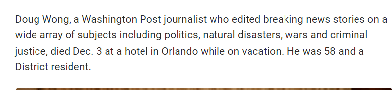 December 7, 2022 Doug Wong, Washington Post news desk editor, dies at 58 He died from GIVE KNOWLEDGE AND SHARE THIS! Click to share on Facebook (Opens in new window) Facebook Click to share on Telegram (Opens in new window) Telegram Click to share on X (Opens in new window) X Like Loading... Related