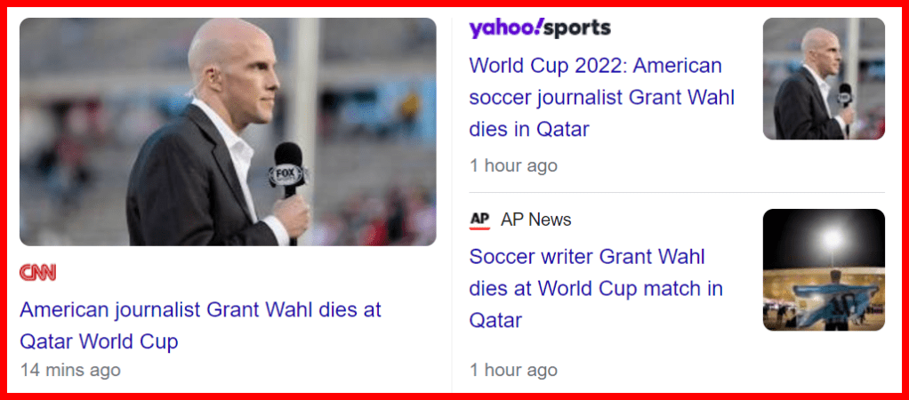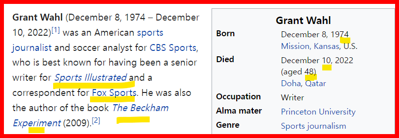 December 9, 2022 Soccer journalist Grant Wahl has died after he collapsed during a match in Qatar American Journalist killed on 12/10 like 121 Dead 149 days after anniversary of his book release GIVE KNOWLEDGE AND SHARE THIS! Share on Facebook (Opens in new window) Facebook Share on Telegram (Opens in new window) Telegram Share on X (Opens in new window) X Like Loading... Related