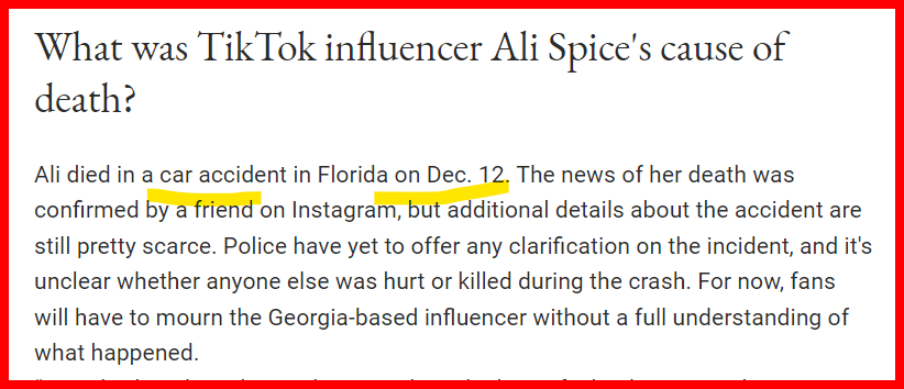 December 13, 2022 21-Year-Old TikTok Influencer Ali Spice Has Died Following a Car Accident Notice she posted #444 and 4 is the number of death GIVE KNOWLEDGE AND SHARE THIS! Click to share on Facebook (Opens in new window) Facebook Click to share on Telegram (Opens in new window) Telegram Click to share on X (Opens in new window) X Like Loading... Related