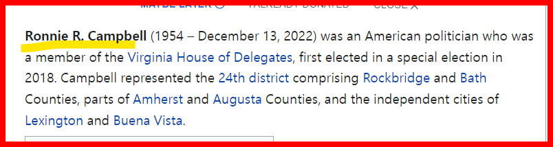 December 13, 2022December 13, 2022 Virginia lawmaker Ronnie Campbell dies at 68 Gov. Glenn Youngkin makes the headlines with his death I will decode more on this once I find a Birthday. GIVE KNOWLEDGE AND SHARE THIS! Click to share on Facebook (Opens in new window) Facebook Click to share on Telegram (Opens in new window) Telegram Click to share on X (Opens in new window) X Like Loading... Related