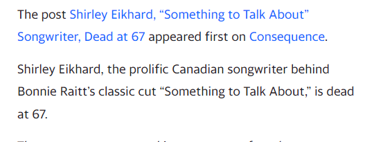 December 15, 2022 Shirley Eikhard, “Something to Talk About” Songwriter, Dead at 67 Dead 38 days after her Birthday. The song released on June 3rd and she is dead 170 days before the anniversary GIVE KNOWLEDGE AND SHARE THIS! Click to share on Facebook (Opens in new window) Facebook Click to share on Telegram (Opens in new window) Telegram Click to share on X (Opens in new window) X Like Loading... Related