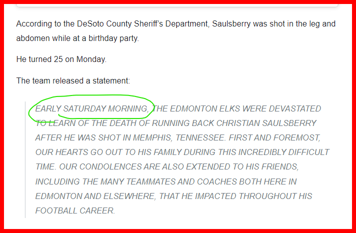 Edmonton Elks’ Christian Saulsberry fatally shot in Memphis, Killed At 25. Christian killed on Saturnalia