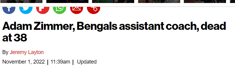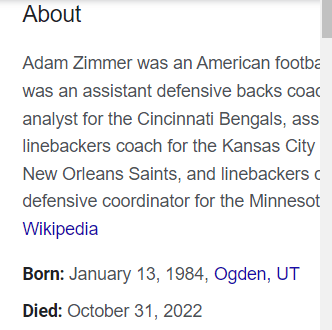 Adam Zimmer, who served on the Minnesota Vikings’ coaching staff for nine seasons under his father Mike Zimmer, has died at the age of 38,