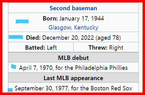 December 22, 2022December 22, 2022 Former major league infielder Denny Doyle passed away Tuesday, according to multiple reports. He was 78 years old. He has died 28 days before his 79th Birthday dead 257 days after his debut anniversary Debut on April 7th, 4/7 or 7/4 GIVE KNOWLEDGE AND SHARE THIS! Click to share on Facebook (Opens in new window) Facebook Click to share on Telegram (Opens in new window) Telegram Click to share on X (Opens in new window) X Like Loading... Related