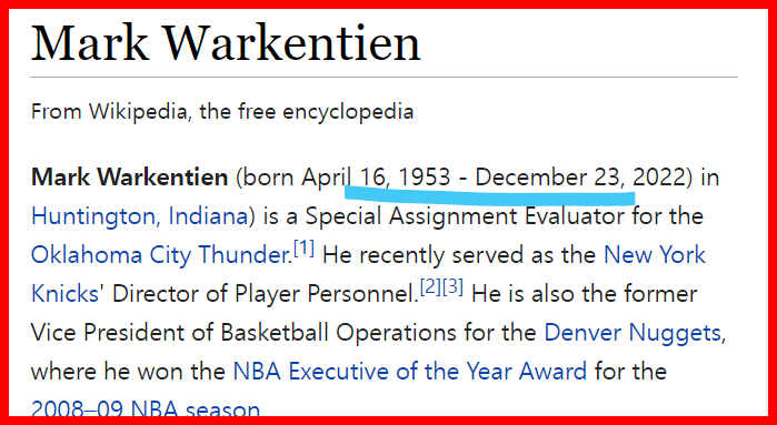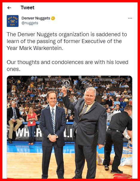 December 24, 2022 The Denver Nuggets organization is saddened to learn of the passing of former Executive of the Year Mark Warkentein. He started his career with the Seattle Supersonics and he is dead at the age of 69 GIVE KNOWLEDGE AND SHARE THIS! Click to share on Facebook (Opens in new window) Facebook Click to share on Telegram (Opens in new window) Telegram Click to share on X (Opens in new window) X Like Loading... Related