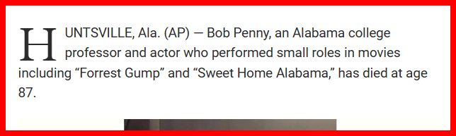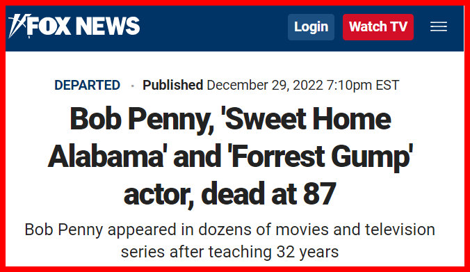 December 29, 2022December 29, 2022 Bob Penny, bit actor in numerous Hollywood films, dies at 87 Dead 187-day span before his birthday The National Murder Code GIVE KNOWLEDGE AND SHARE THIS! Share on Facebook (Opens in new window) Facebook Share on Telegram (Opens in new window) Telegram Share on X (Opens in new window) X Like Loading... Related