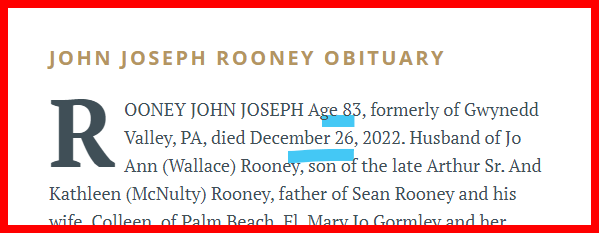 December 30, 2022 Steelers minority owner John Rooney passed away at age of 83. He was the son of team founder Arthur J. Rooney. dead at age 83, He is the son of the Steelers founder. He is dead 243 days before his Dad’s Death date. GIVE KNOWLEDGE AND SHARE THIS! Share on Facebook (Opens in new window) Facebook Share on Telegram (Opens in new window) Telegram Share on X (Opens in new window) X Like Loading... Related