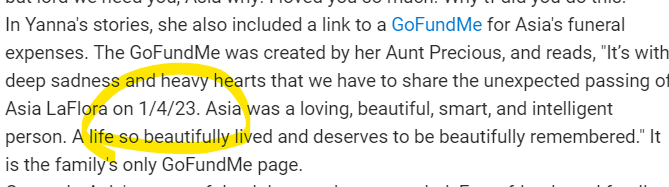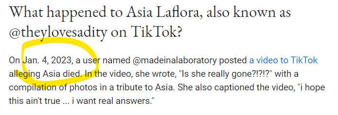 January 6, 2023January 6, 2023 TikTok User Theylovesadity, Better Known as Asia LaFlora, Has Died. Skull and Bones strikes again. Dead Jan 4th 1/4 or 4/1 The start of 2023 brings a TikTok Death on Jan 4th 4/1 GIVE KNOWLEDGE AND SHARE THIS! Share on Facebook (Opens in new window) Facebook Share on Telegram (Opens in new window) Telegram Share on X (Opens in new window) X Like Loading... Related