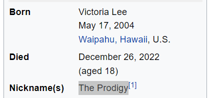 She is dead 143 days before her next Birthday and she is known as The Prodigy