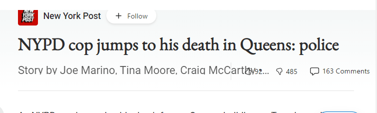 An NYPD cop jumped to his death from a Queens building on Tuesday, police say