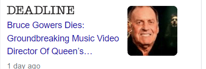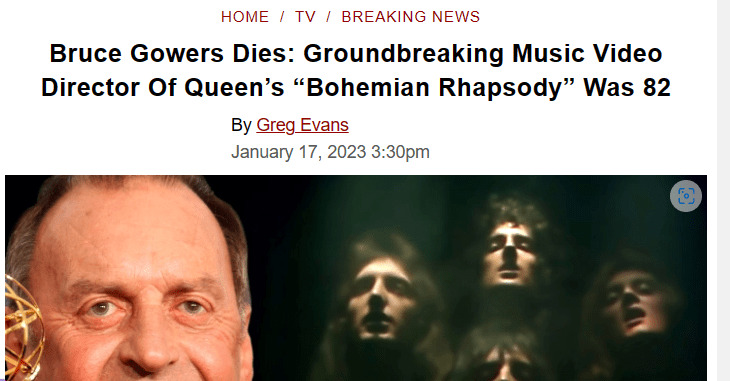 January 18, 2023January 18, 2023 Bruce Gowers Dies: Director Of Queen’s “Bohemian Rhapsody” Was 82 Died on 1/15 25 days after his Birthday He directed the Bohemian Rhapsody which began recording on 24/8 GIVE KNOWLEDGE AND SHARE THIS! Click to share on Facebook (Opens in new window) Facebook Click to share on Telegram (Opens in new window) Telegram Click to share on X (Opens in new window) X Like Loading... Related