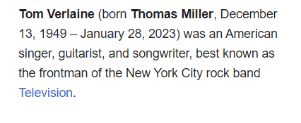 January 29, 2023January 29, 2023 Tom Verlaine, singer and guitarist for seminal art-punk band Television, dies at 73 Dead age 73 and 46 days after his birthday GIVE KNOWLEDGE AND SHARE THIS! Share on Facebook (Opens in new window) Facebook Share on Telegram (Opens in new window) Telegram Share on X (Opens in new window) X Like Loading... Related