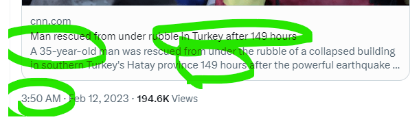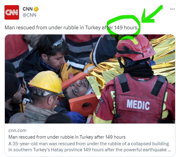 February 12, 2023 35 yr old rescued after 149 hours in Turkey GIVE KNOWLEDGE AND SHARE THIS! Click to share on Facebook (Opens in new window) Facebook Click to share on Telegram (Opens in new window) Telegram Click to share on X (Opens in new window) X Like Loading... Related