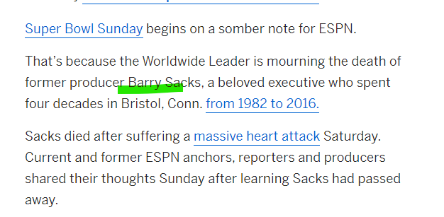 Long time ESPN legend Barry Sacks passed away today. He always told people look for a play in a game that makes you say ” wow”. If you see a wow play tonight… think of Barry. Thanks