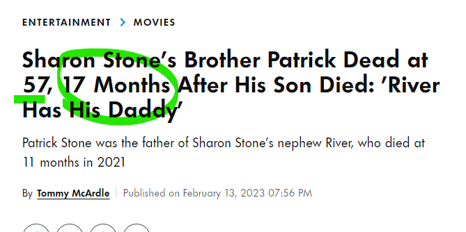 One thought on “Sharon Stone’s Brother Patrick Dead at 57, 17 Months After His Son Died on the day of Super Bowl 57