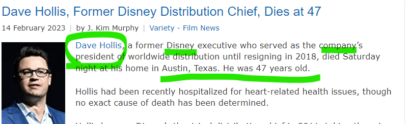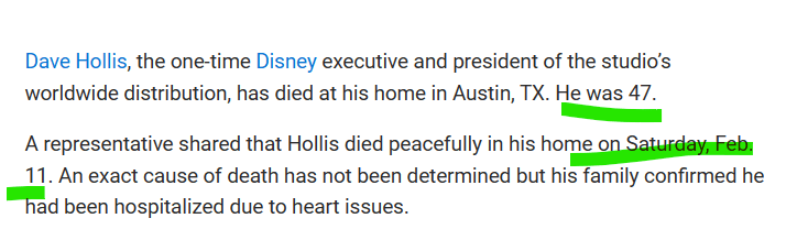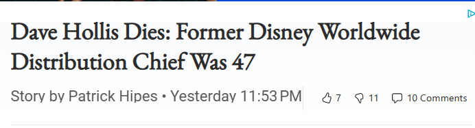 February 14, 2023 Dave Hollis Dies: Former Disney Worldwide Distribution Chief Was 47 DEAD ON 11/2 ANNOUNCEMENT CAME ON THE 44th DAY. He spent 17 years with Disney GIVE KNOWLEDGE AND SHARE THIS! Share on Facebook (Opens in new window) Facebook Share on Telegram (Opens in new window) Telegram Share on X (Opens in new window) X Like Loading... Related