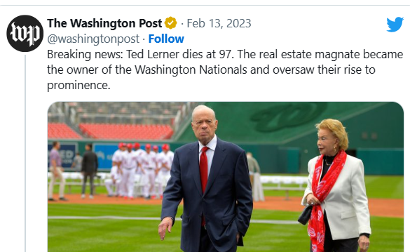 February 14, 2023 Washington Nationals team owner Ted Lerner, dead at 97. Dead on the same day of the Super Bowl to end the 103rd season. Dead 121 day span from birthday The day of skull and Bones GIVE KNOWLEDGE AND SHARE THIS! Share on Facebook (Opens in new window) Facebook Share on Telegram (Opens in new window) Telegram Share on X (Opens in new window) X Like Loading... Related