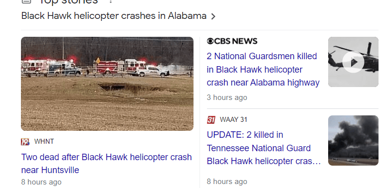February 16, 2023 2 dead after Black Hawk helicopter crashes onto Alabama highway GIVE KNOWLEDGE AND SHARE THIS! Share on Facebook (Opens in new window) Facebook Share on Telegram (Opens in new window) Telegram Share on X (Opens in new window) X Like Loading... Related