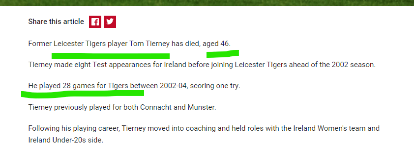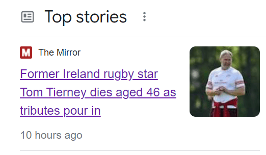 February 24, 2023 Former Ireland rugby star Tom Tierney dies aged 46 GIVE KNOWLEDGE AND SHARE THIS! Click to share on Facebook (Opens in new window) Facebook Click to share on Telegram (Opens in new window) Telegram Click to share on X (Opens in new window) X Like Loading... Related