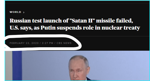February 25, 2023 Satan II Nuclear Missile on 2/22 GIVE KNOWLEDGE AND SHARE THIS! Share on Facebook (Opens in new window) Facebook Share on Telegram (Opens in new window) Telegram Share on X (Opens in new window) X Like Loading... Related