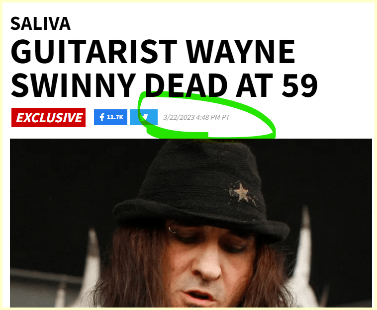 March 22, 2023March 22, 2023 SALIVA GUITARIST WAYNE SWINNY DEAD AT AGE 59 in a 223 Ritual for 22/3 The killing of Wayne Swinny on Skull and Bones day. Dead 223 days before his birthday on 22/3 GIVE KNOWLEDGE AND SHARE THIS! Click to share on Facebook (Opens in new window) Facebook Click to share on Telegram (Opens in new window) Telegram Click to share on X (Opens in new window) X Like Loading... Related