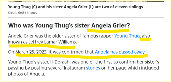 March 27, 2023 Young Thug’s Older Sister Angela Grier Passes Away March 25 they confirmed her death, 144 days from his birthday. GIVE KNOWLEDGE AND SHARE THIS! Click to share on Facebook (Opens in new window) Facebook Click to share on Telegram (Opens in new window) Telegram Click to share on X (Opens in new window) X Like Loading... Related