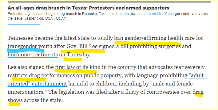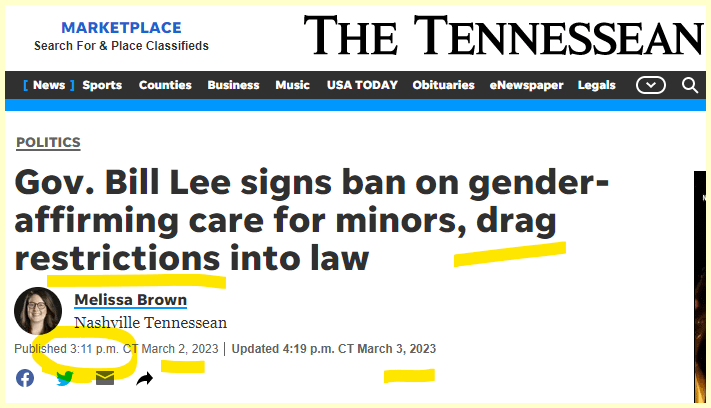 On March 2nd Gov Bill Lee in Tennessee signed a Drag restriction and gender surgery ban.