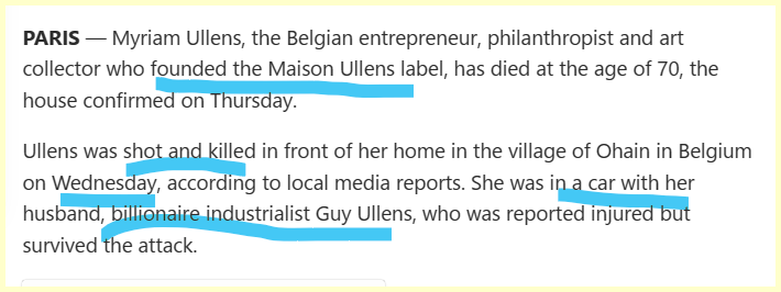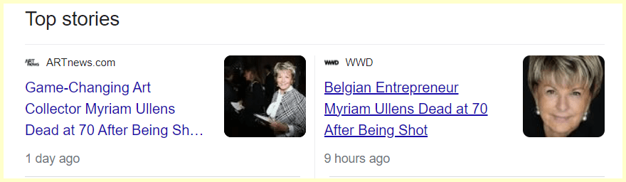 March 30, 2023 INFLUENTIAL COLLECTOR MYRIAM ULLENS SHOT DEAD Shot and killed 187 days from her birthday GIVE KNOWLEDGE AND SHARE THIS! Click to share on Facebook (Opens in new window) Facebook Click to share on Telegram (Opens in new window) Telegram Click to share on X (Opens in new window) X Like Loading... Related