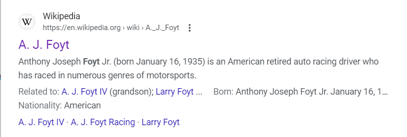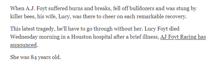 April 5, 2023April 5, 2023 Lucy Foyt, wife of Indy 500 winner A.J. Foyt, dies at 84 She is dead at the age of 84 and 79 days from AJ Birthday Dead on 4/5 or 5/4 April 5th GIVE KNOWLEDGE AND SHARE THIS! Share on Facebook (Opens in new window) Facebook Share on Telegram (Opens in new window) Telegram Share on X (Opens in new window) X Like Loading... Related