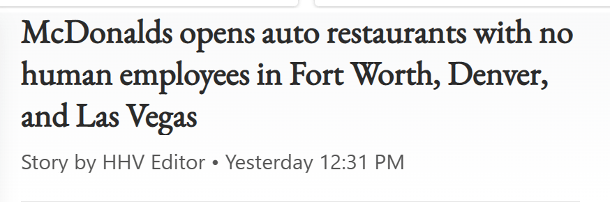 April 10, 2023 McDonalds opens auto restaurants with no human employees in Fort Worth, Denver, and Las Vegas GIVE KNOWLEDGE AND SHARE THIS! Share on Facebook (Opens in new window) Facebook Share on Telegram (Opens in new window) Telegram Share on X (Opens in new window) X Like Loading... Related