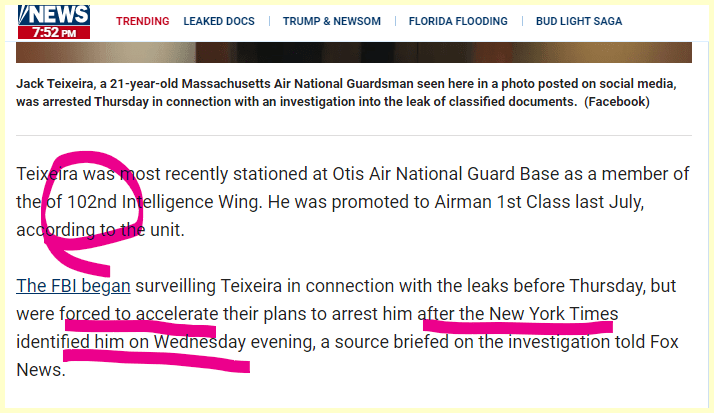 He is a member of the 102 Intelligence Wing and the NYT found out Wednesday, so the FBI had to arrest him quickly