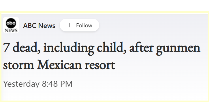 April 17, 2023 Gunman kills 7 at Mexican Resort GIVE KNOWLEDGE AND SHARE THIS! Click to share on Facebook (Opens in new window) Facebook Click to share on Telegram (Opens in new window) Telegram Click to share on X (Opens in new window) X Like Loading... Related