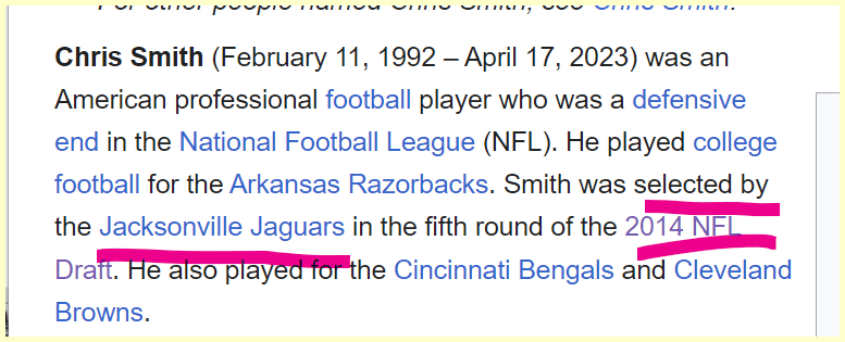 April 18, 2023 former Cleveland Browns defensive end Chris Smith has passed away Dead 66 days from birthday DRAFTED BY THE JAGS GIVE KNOWLEDGE AND SHARE THIS! Share on Facebook (Opens in new window) Facebook Share on Telegram (Opens in new window) Telegram Share on X (Opens in new window) X Like Loading... Related