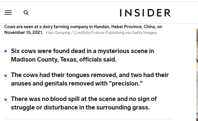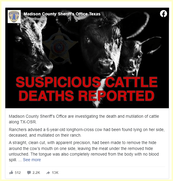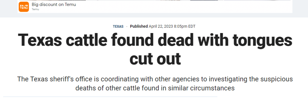 April 22, 2023 Texas cattle found dead with tongues cut out, no blood spilled in a 201 Ritual. The police announced the dead cows on Wednesday 19/4 158 days from Gov Birthday 109 days from the Mayor Birthday GIVE KNOWLEDGE AND SHARE THIS! Share on Facebook (Opens in new window) Facebook Share on Telegram (Opens in new window) Telegram Share on X (Opens in new window) X Like Loading... Related
