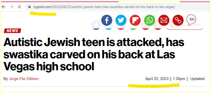 April 24, 2023April 24, 2023 Mother says autistic Jewish son came home with swastika carved into his back. GIVE KNOWLEDGE AND SHARE THIS! Share on Facebook (Opens in new window) Facebook Share on Telegram (Opens in new window) Telegram Share on X (Opens in new window) X Like Loading... Related